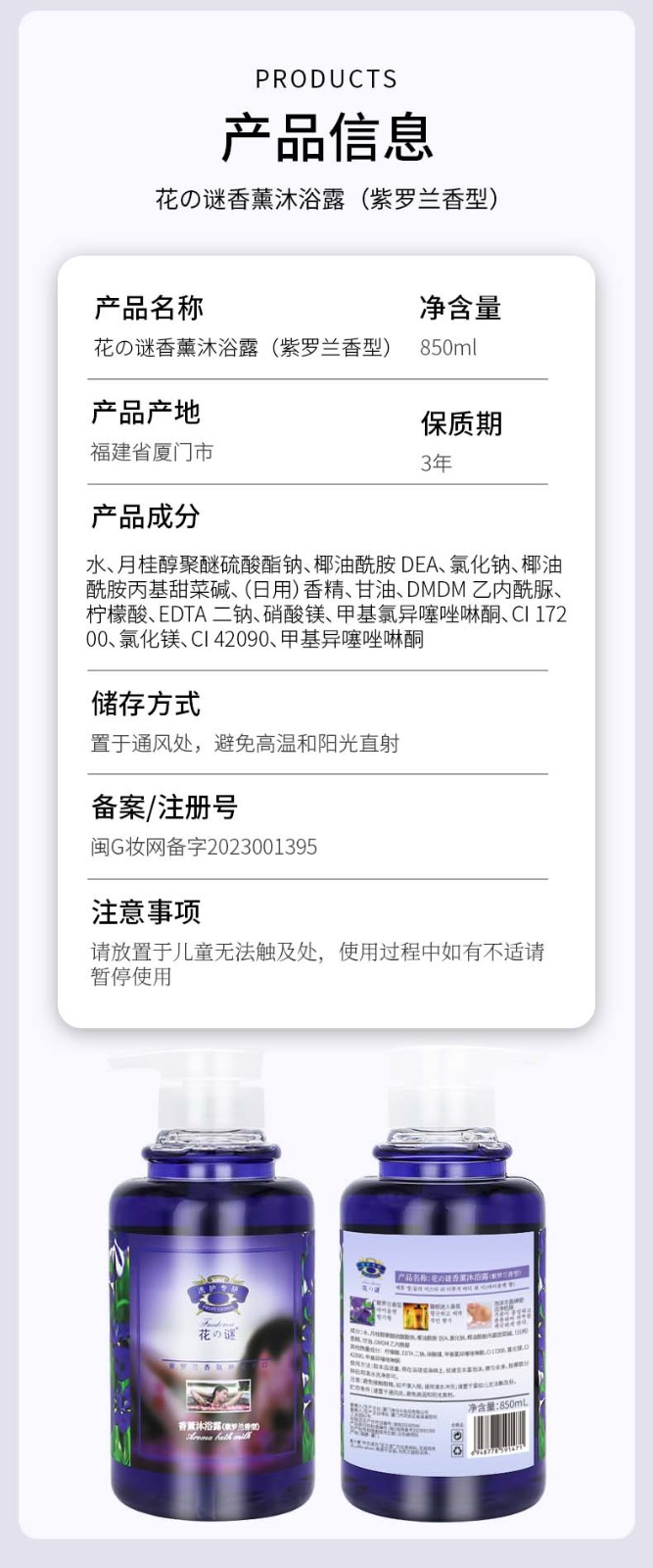 【包邮】花の谜香薰沐浴露(紫罗兰香型850ml  支持门店配送