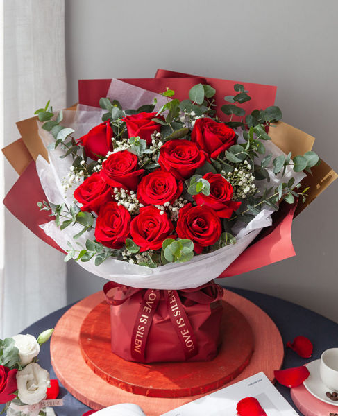 鲜花主材:卡罗拉红玫瑰、白色满天星、尤加利